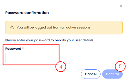 - Por motivos de seguridad, el sistema requerirá una confirmación de contraseña cuando solicites actualizar la dirección de correo electrónico. Todas tus sesiones abiertas modificadas se cerrarán una vez se complete el cambio.