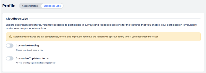 Probar funciones experimentales permite que los usuarios compartan y nos envíen comentarios, pero ten en cuenta que no garantiza que las funciones se implementen por completo en Cloudbeds PMS.