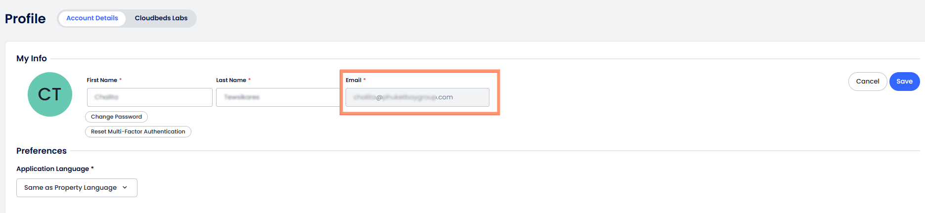 Si tu dirección de correo electrónico está vinculada a más de una propiedad de Cloudbeds (acceso multi-propiedad), el campo Correo electrónico en Cuenta > Mi perfil puede aparecer en gris y el botón Guardar puede estar deshabilitado.