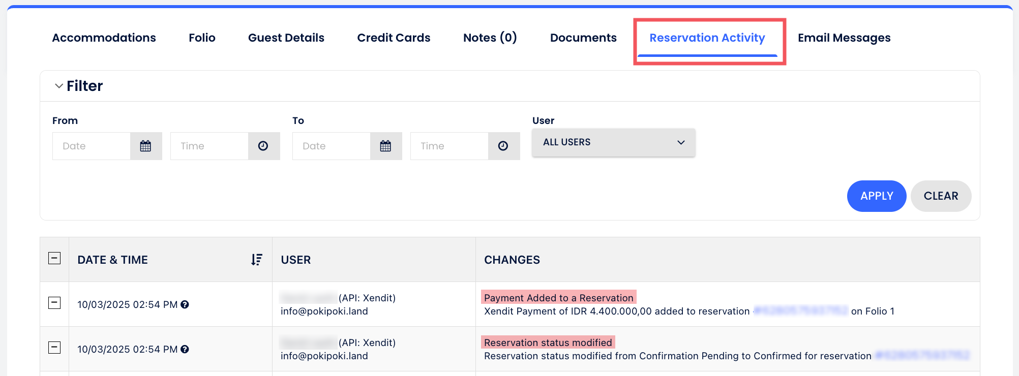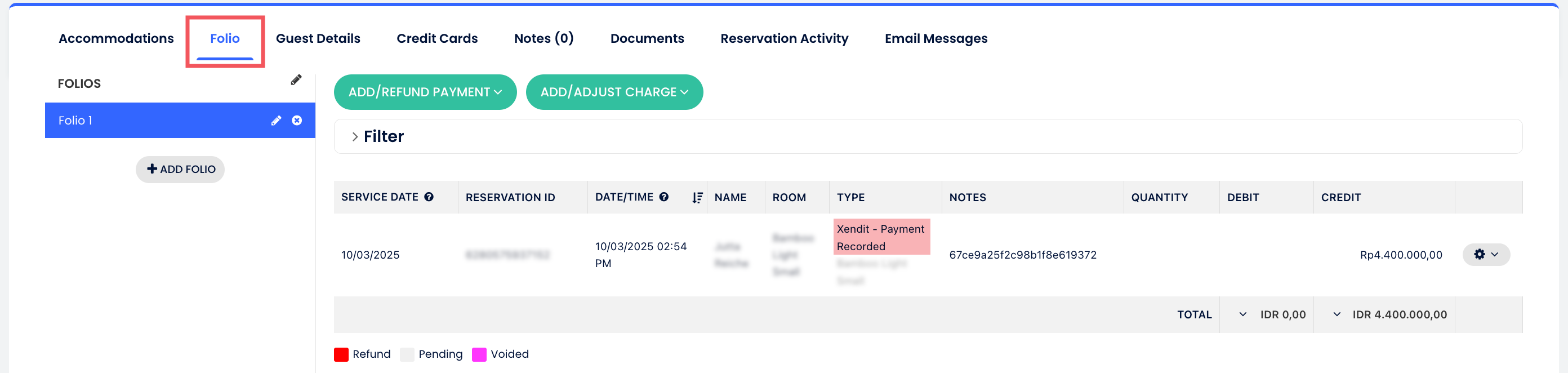 Después de un pago exitoso, Xendit registrará la transacción en el folio de la reserva y actualizará el estado de "Pendiente de Confirmación" a "Confirmado". El pago también aparecerá en la pestaña de actividad de la reserva.