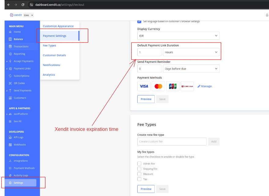 Xendit tiene una configuración de 'Duración del enlace de pago estándar'. Por defecto, la configuración es de 24 horas, pero siempre puedes cambiar eso.