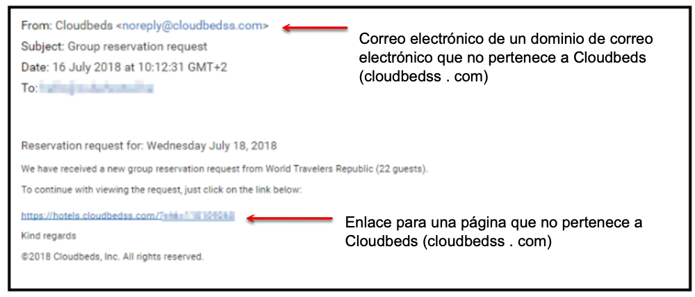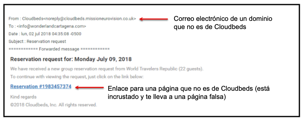 - Verifica que el correo electrónico sea de un dominio oficial @cloudbeds.com (por ejemplo, support@cloudbeds.com) y no de imitaciones como @cloudbeds.xyz