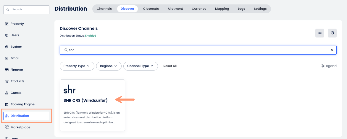 - En la pestaña Descubrir, busca SHR CRS y haz clic en la tarjeta del canal