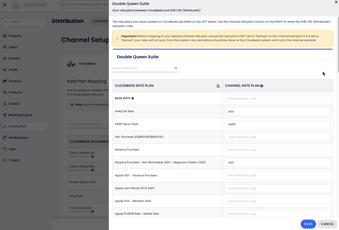 Importante: La tarifa base en Cloudbeds normalmente solo debe mapearse al Booking Engine y/o al Sistema Global de Distribución (GDS) de SHR. Todos los demás códigos de tarifa deben mapearse a sus propios planes tarifarios separados en Cloudbeds.