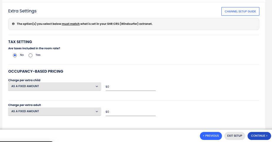 - Agrega un Ajuste de tarifa base para cada tipo de habitación (si es necesario). Cuando termines, haz clic en Continuar, o déjalo en cero si deseas omitirlo.