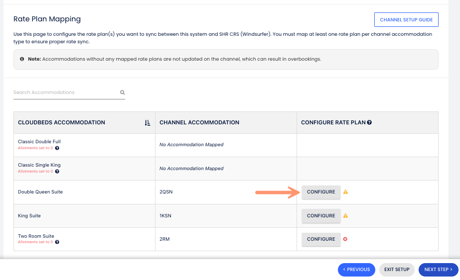 Mapea tus habitaciones. Ingresa el código de habitación de SHR CRS en la columna Alojamiento del canal.