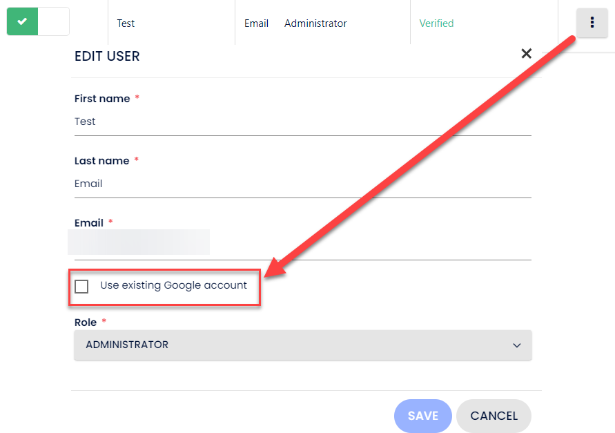 Un administrador debe otorgar permiso para que un usuario utilice la función "Usar cuenta de Google existente".