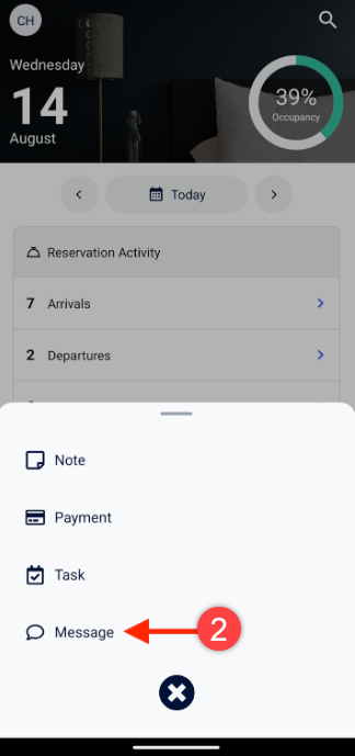 opción en el Menú de Añadir Rápido permite a los usuarios iniciar una conversación con los huéspedes directamente desde la aplicación Cloudbeds y comunicarse en movimiento.