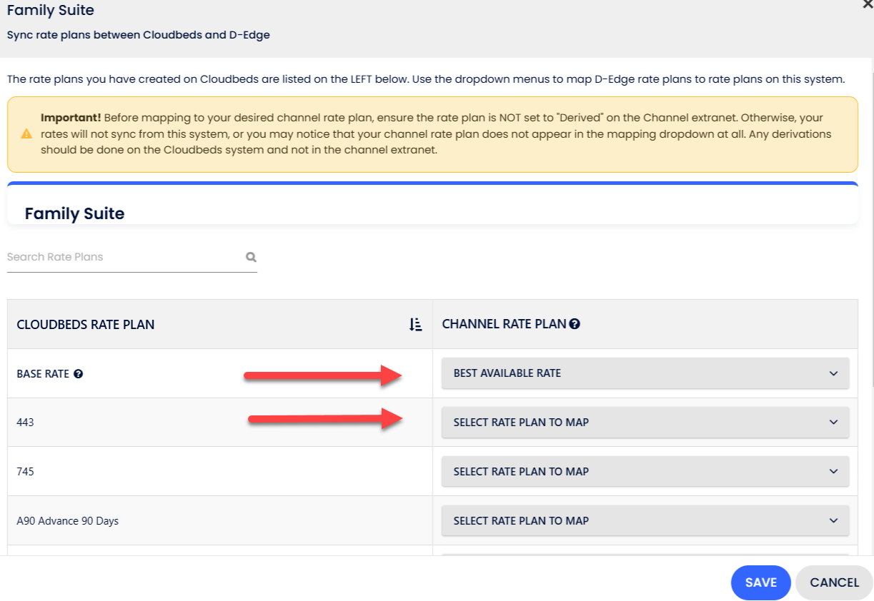 - Mapeo de planes de tarifas. Haz clic para configurar el plan de tarifas de cada habitación.