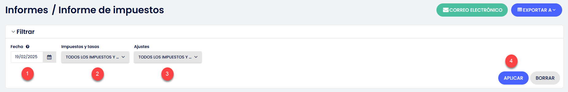 - Acumulado mensual - Cantidad de impuestos/tarifas del mes hasta la fecha seleccionada en el filtro.