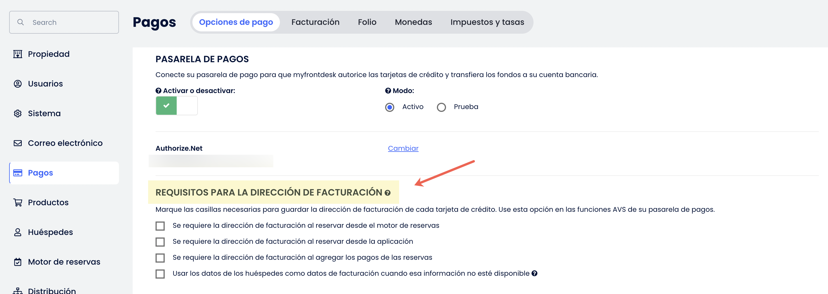 Si tienes una pasarela de pago conectada al PMS de Cloudbeds, puede requerir que la tarjeta de crédito del huésped incluya la dirección de facturación al procesar el pago. El PMS de Cloudbeds no controla si las OTA requieren o no a los huéspedes agregar una dirección de facturación.