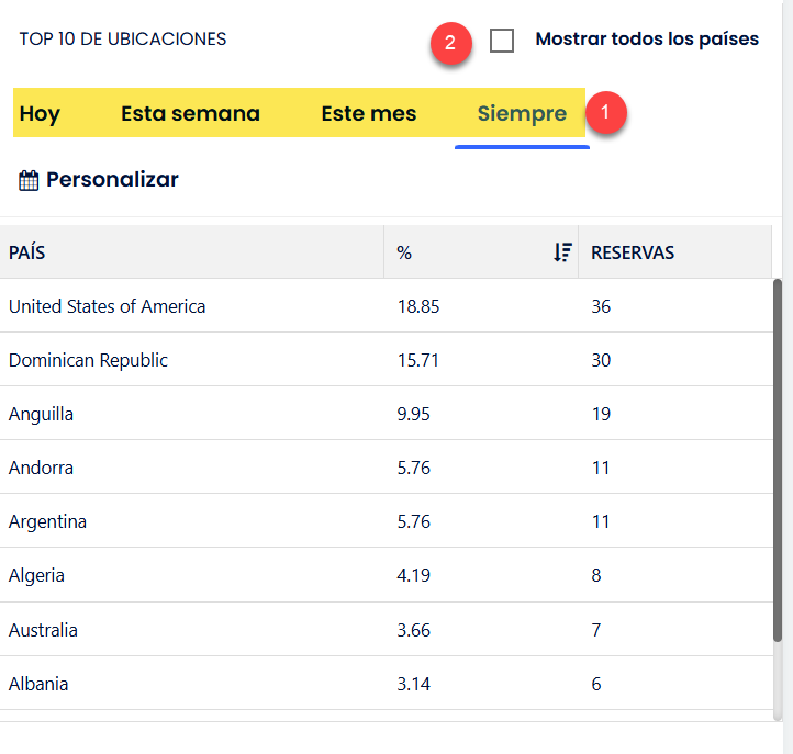 Este informe muestra un desglose del total de reservas creadas por país. Puedes verificar las reservas totales creadas hoy, esta semana, este mes y en cualquier momento o fechas personalizadas.
