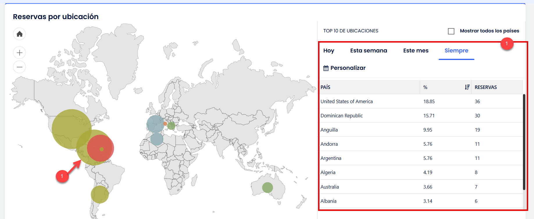 - El resultado se visualiza con el mapa en el lado izquierdo. Cada país se destaca con un círculo de diferentes tamaños y colores dependiendo del volumen de reservas. Pase el cursor sobre el círculo para ver el número de reservas.