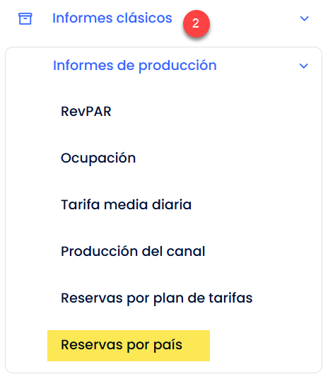- Haz clic en Informes de producción y selecciona el informe Reservas por país
