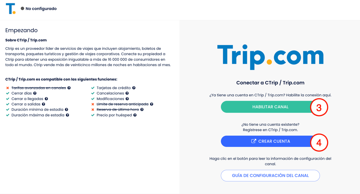 - Contacte a su gerente de cuenta en Trip.com y solicite que habiliten la conexión con el administrador de canales de Cloudbeds.