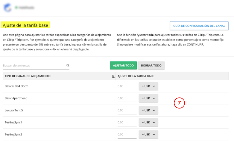 - Agregue un Ajuste a la Tarifa Base para cada categoría de habitación si es necesario. Haga clic en Continuar cuando haya terminado o deje los campos en cero para omitir.