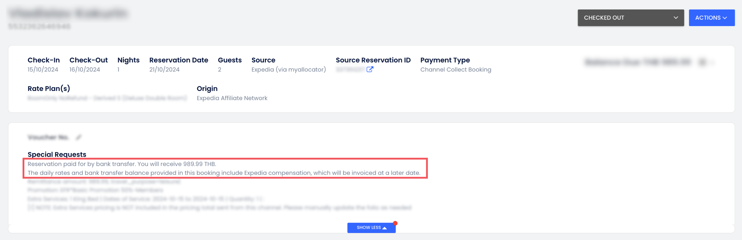 Cuando recibes reservas de Expedia Channel Collect, se muestran los siguientes mensajes en el campo de Solicitud especial basados en cada carga útil de reserva: