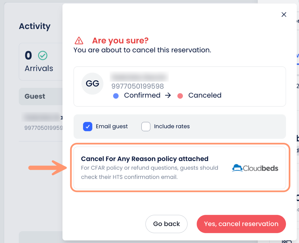 - Compatibilidad con pasarelas de pago: Cancelación por cualquier motivo es compatible con la mayoría de las pasarelas de pago compatibles con Cloudbeds, incluidas Cloudbeds Payments. Sin embargo, Stripe Direct actualmente no es compatible.
