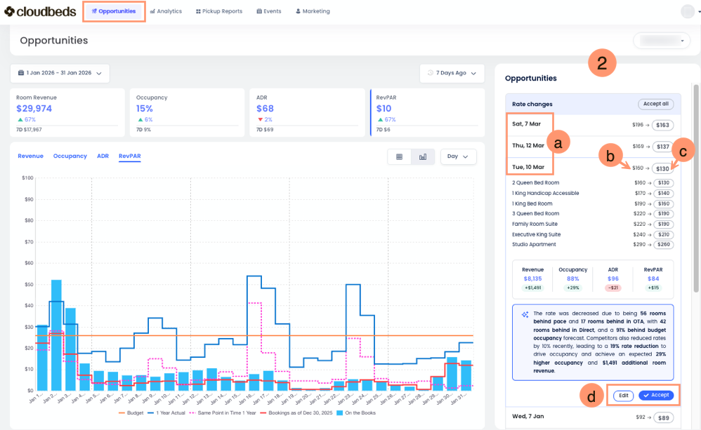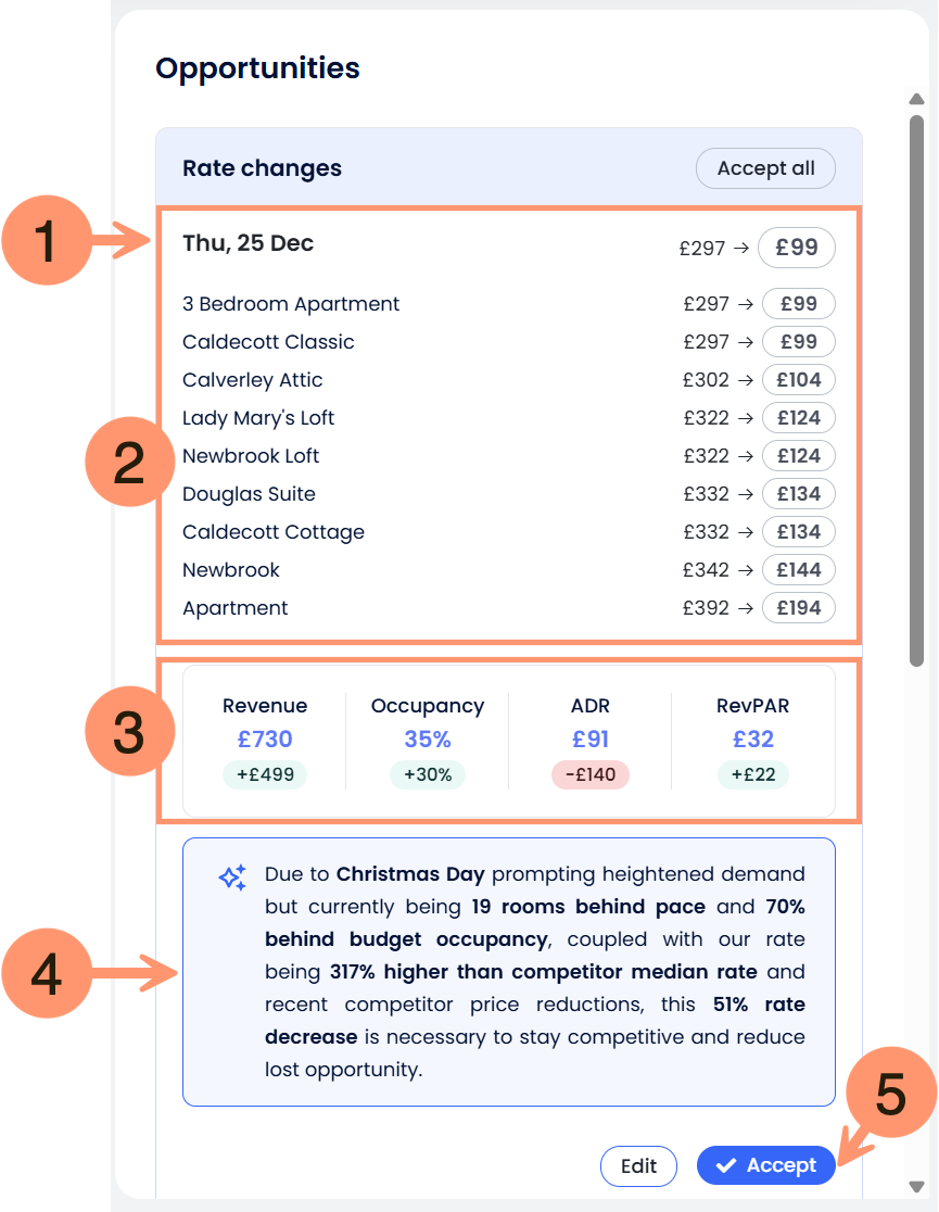 - Botones Aceptar/Editar: Cuando haces clic en un día específico para ver las recomendaciones de tarifas, verás la opción de aceptar o editar la recomendación.