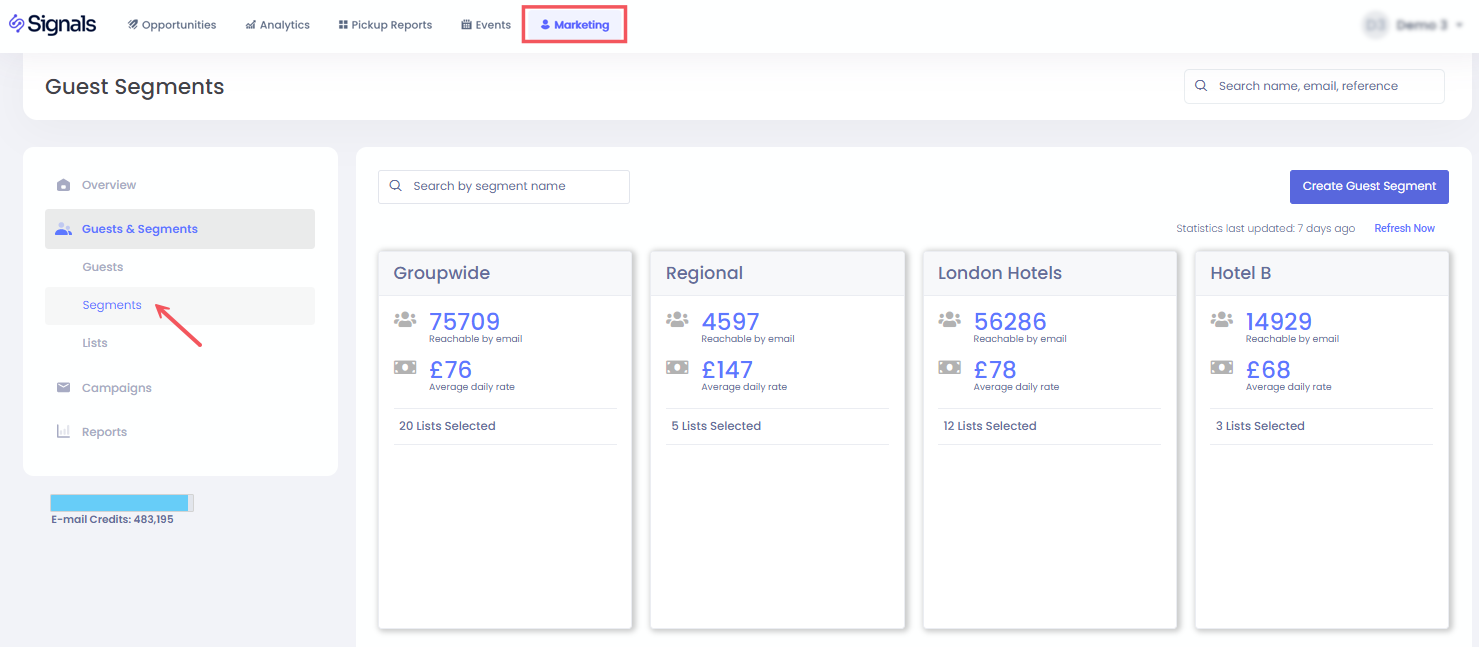 Para ver los contactos en un segmento, ve a la pestaña de Marketing, luego selecciona Huéspedes y Segmentos y haz clic en la sección de Segmentos.