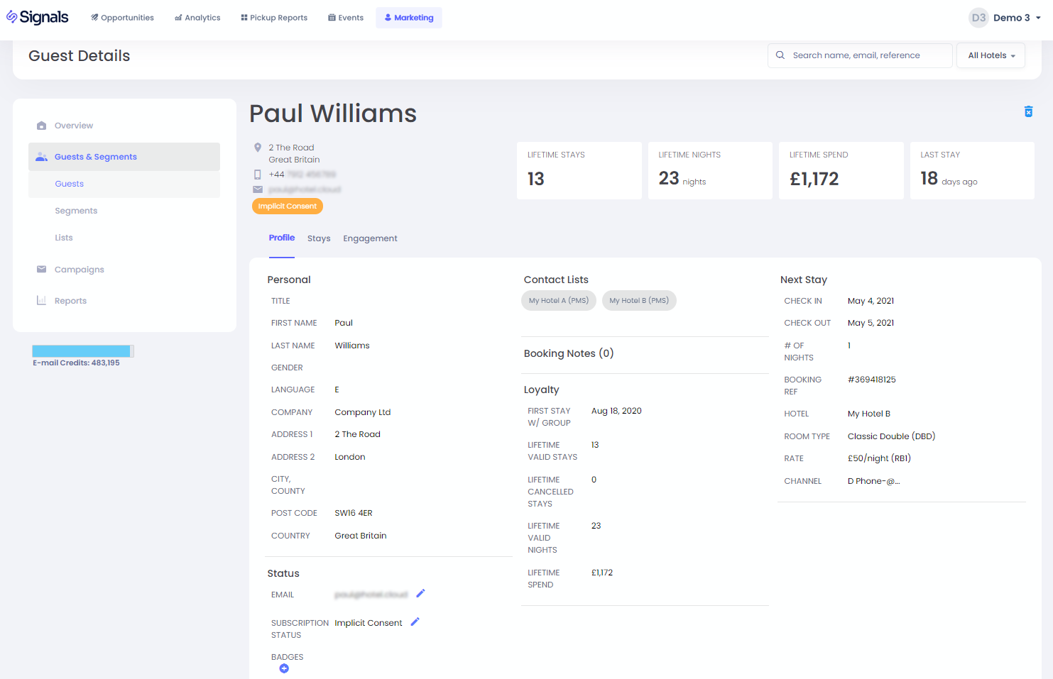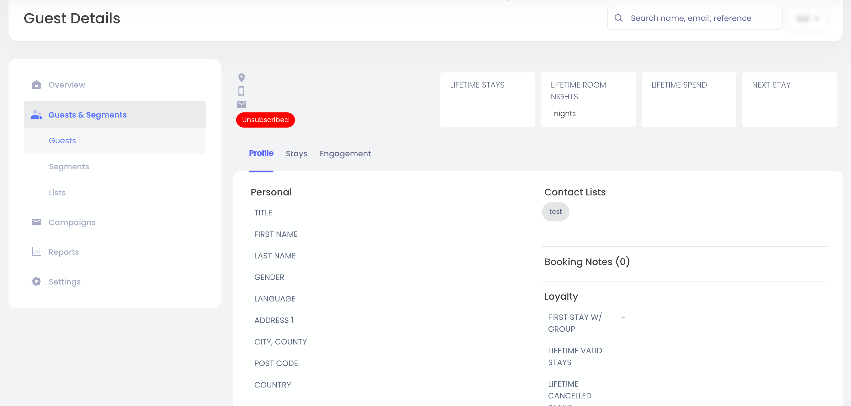 Para acceder a datos detallados sobre un huésped en particular, incluyendo su historial de estadías, interacción por correo electrónico y estado de suscripción, navega hasta la pestaña de Marketing en Revenue Intelligence y haz clic en la sección de Huésped y Segmento.