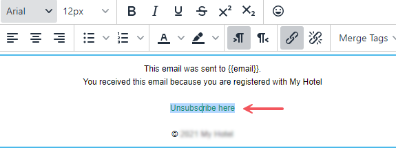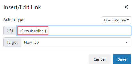 Todas nuestras plantillas predefinidas tienen esto por defecto, pero si creas la tuya propia, simplemente crea un enlace en el editor de arrastrar y soltar con {{unsubscribe}} como destino.