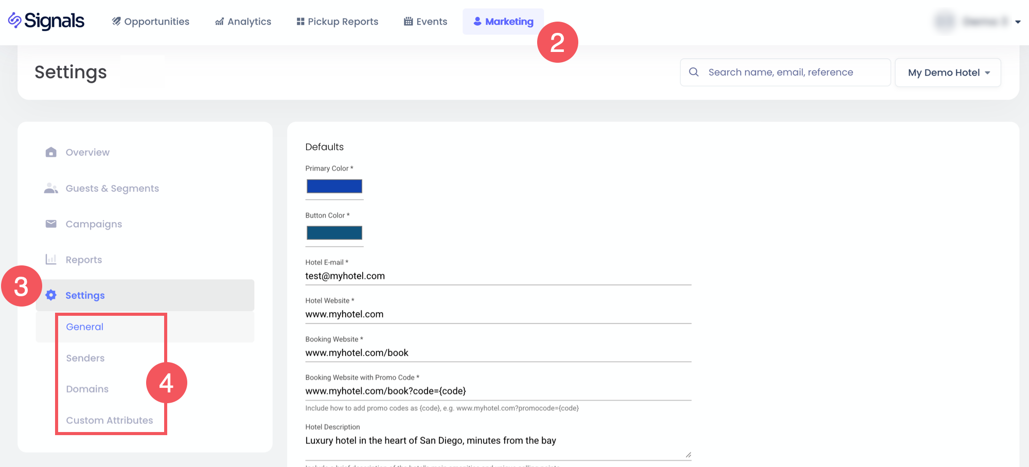 - Correo Electrónico del Hotel: Dirección de correo electrónico de contacto que aparece en el pie de página de la campaña y en la sección del remitente.