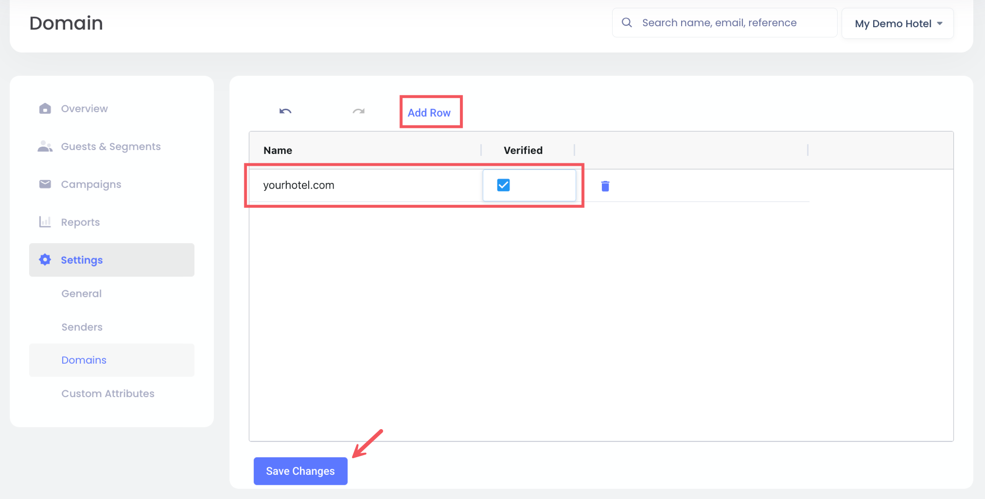 tuhotel.com) y haz clic en Guardar cambios. - Verificar: Haz clic en la casilla en la columna Verificado. Guárdalo, y aparecerá una ventana emergente con instrucciones de registro DNS.