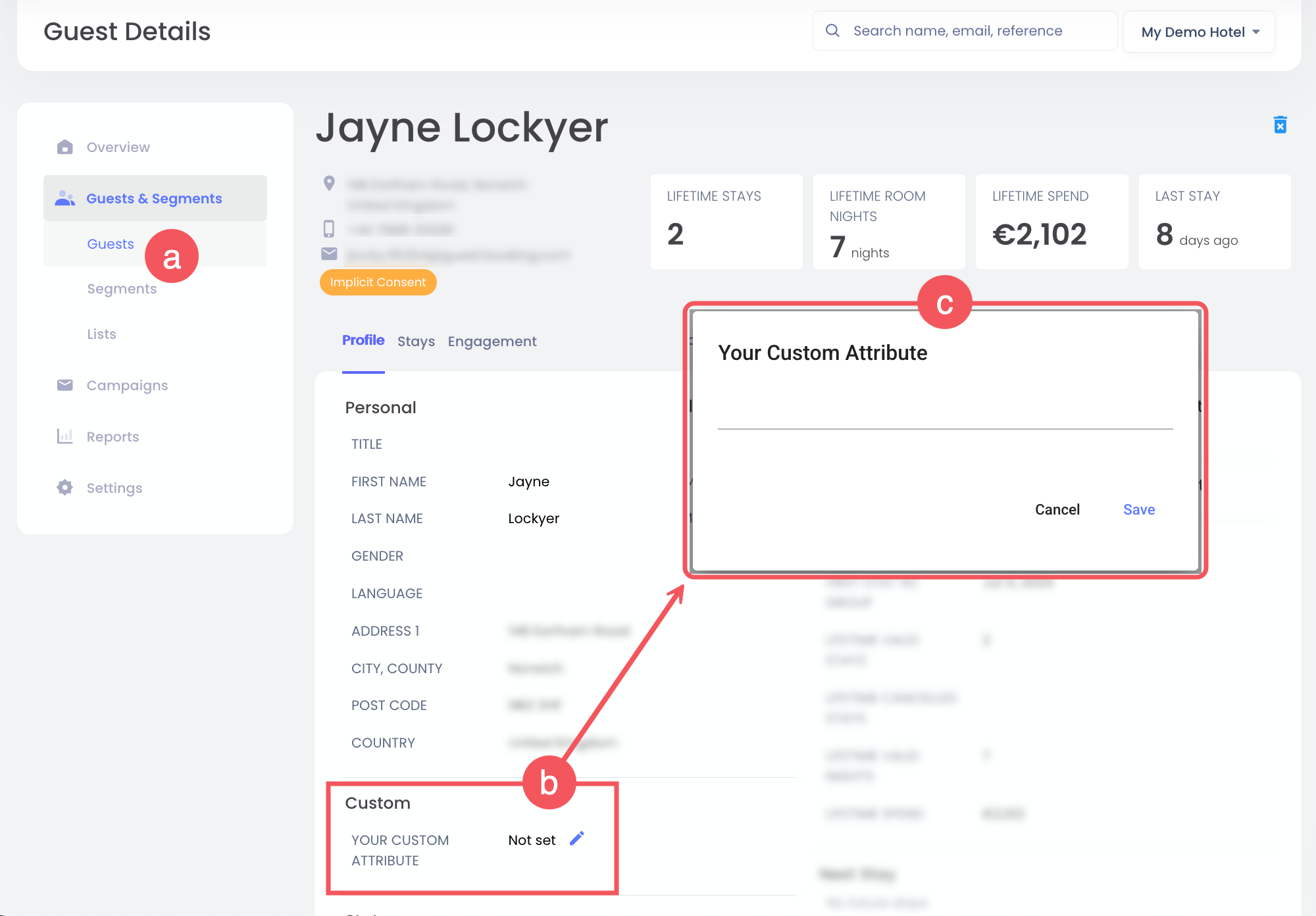 Una vez guardado, este campo se vuelve visible en el perfil del huésped en Perfiles del huésped & Segmentos > Perfiles del huésped. Puedes editar y actualizar manualmente cada atributo personalizado del huésped.