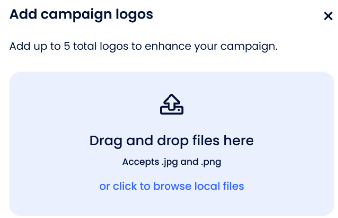 - Puedes subir logotipos arrastrando y soltando los archivos o haciendo clic para buscarlos en tus carpetas locales. Los formatos de archivo admitidos incluyen .jpg y .png.