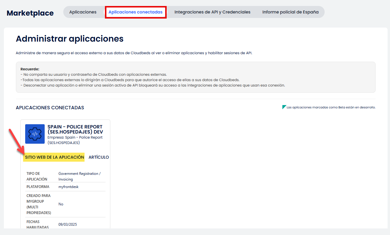 → Aplicaciones conectadas, abre la página de la aplicación para España – Informe Policial (SES.HOSPEDAJES), luego haz clic en Configuración.