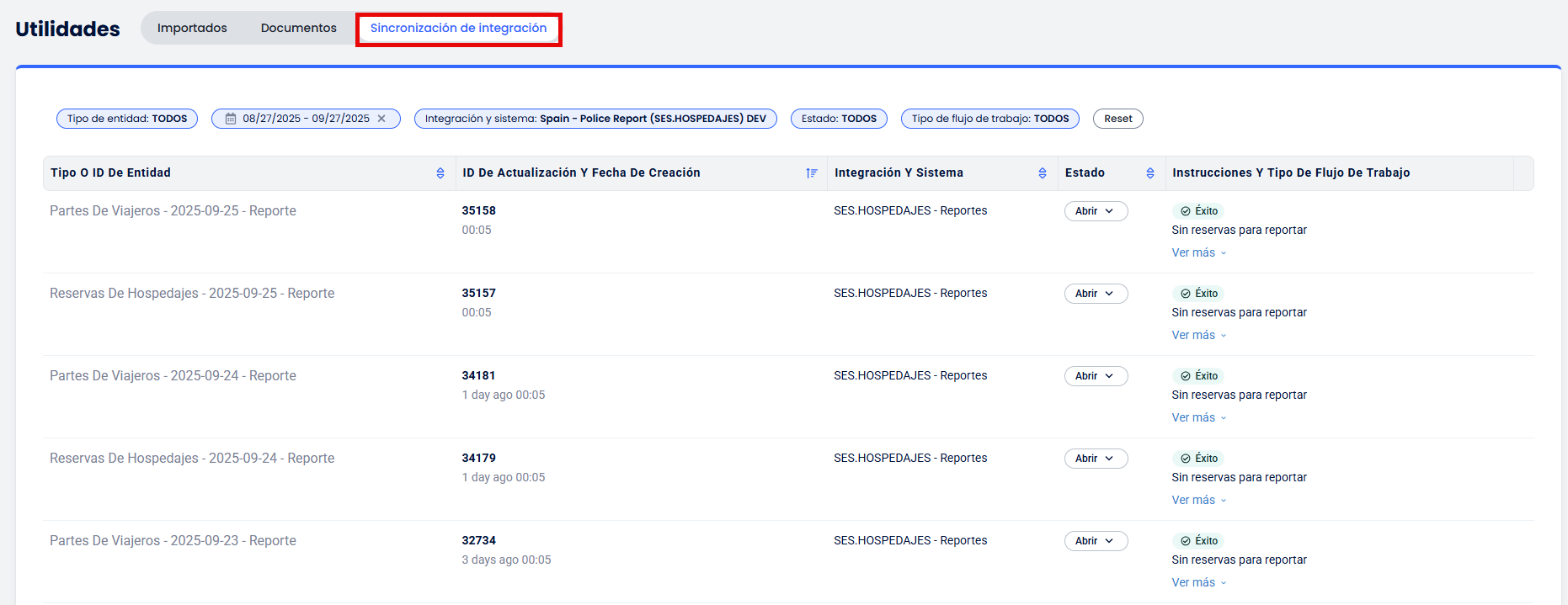 → Sincronización de Integración y revisa las últimas entradas de SES.HOSPEDAJES en busca de errores (por ejemplo, datos faltantes o problemas de conectividad del servicio web).