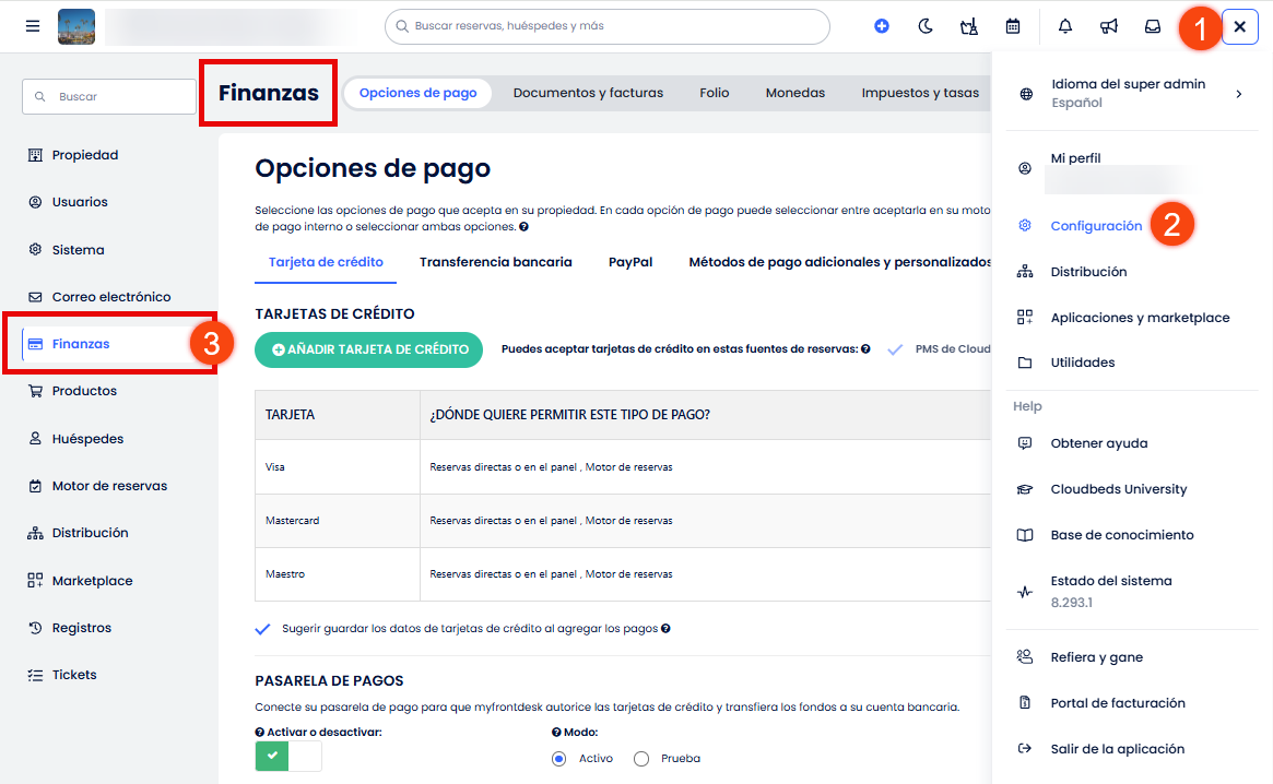 - La sección de Cloudbeds Payments, que se accede desde el Menú principal
