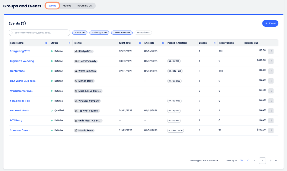 Pestaña Eventos: El espacio de trabajo específico de la propiedad donde gestionas los detalles operativos de una conferencia, boda o grupo turístico, incluidas las fechas, los bloques de asignación y el estado de consumo del bloque.