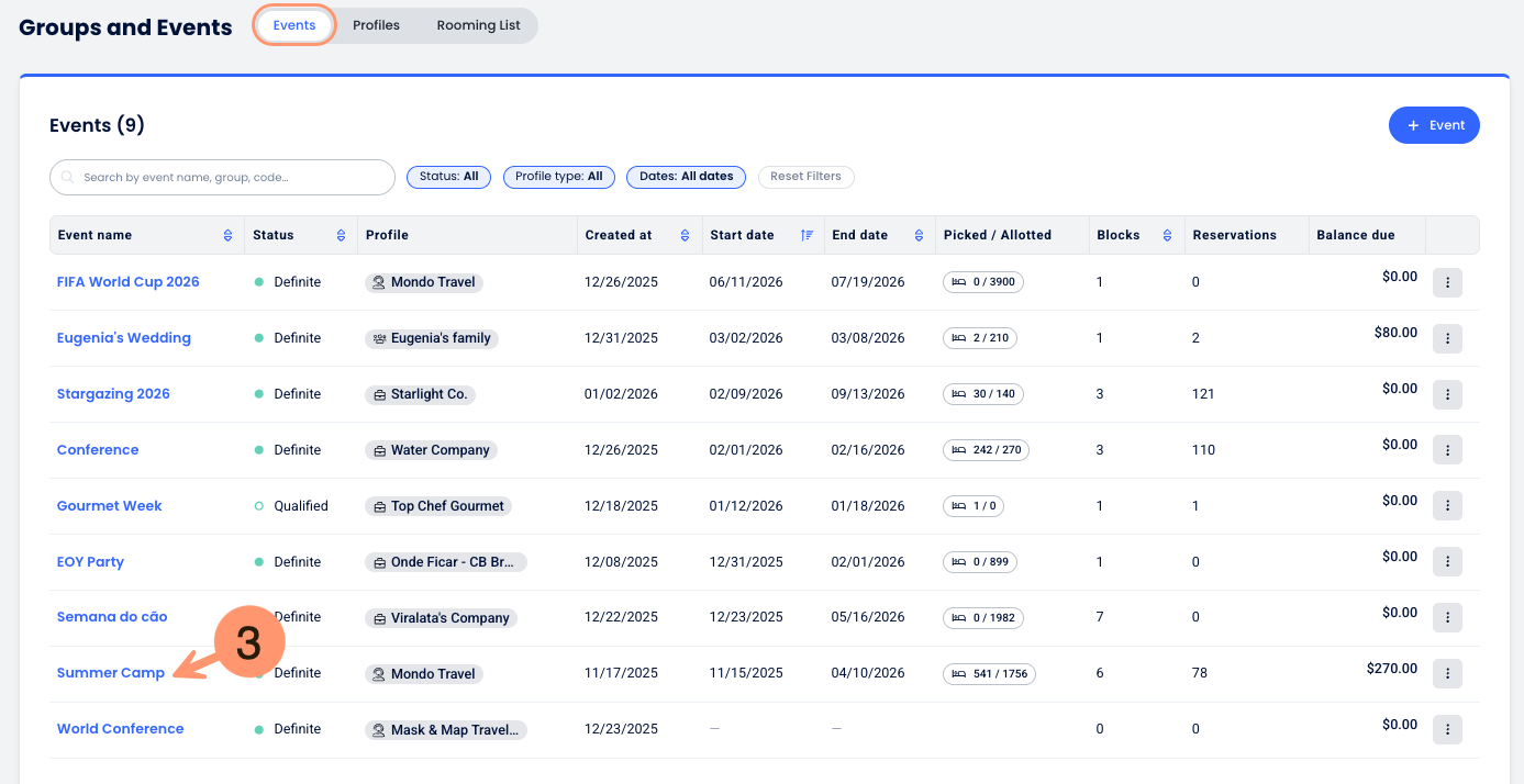 Una vez que se crea un evento en el módulo de Grupos y Eventos, puedes acceder a su espacio de trabajo dedicado para gestionar cada detalle operativo de la estadía. Esta área centralizada es la Vista integral del evento, que permite a las propiedades supervisar los bloques de habitaciones, las listas de huéspedes y la facturación específica de esa ocasión.
