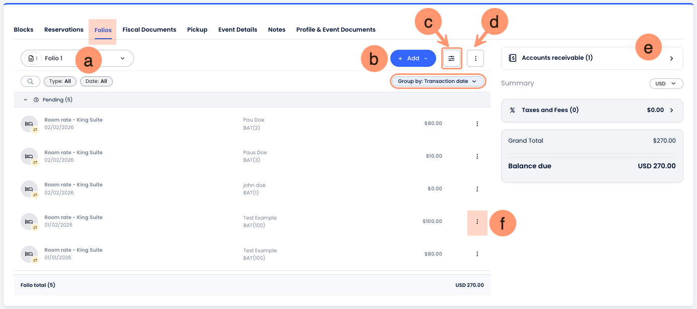 - Filtrado y agrupación avanzados: Organiza la lista de transacciones por fecha de la transacción, fecha del servicio o reserva para facilitar auditorías. También puedes usar el panel de Filtros para buscar por nombre del huésped, número de habitación o estado de la transacción (Registrada vs. Pendiente).