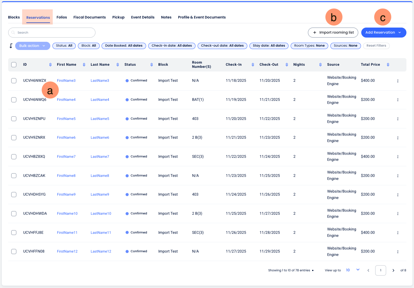 La pestaña Reservas ofrece un espacio consolidado para gestionar cada estadía individual asociada al evento. Es el área operativa principal para asignar nombres de huéspedes a tus bloques de cupo y monitorear el estado actual de cada reserva dentro del grupo.