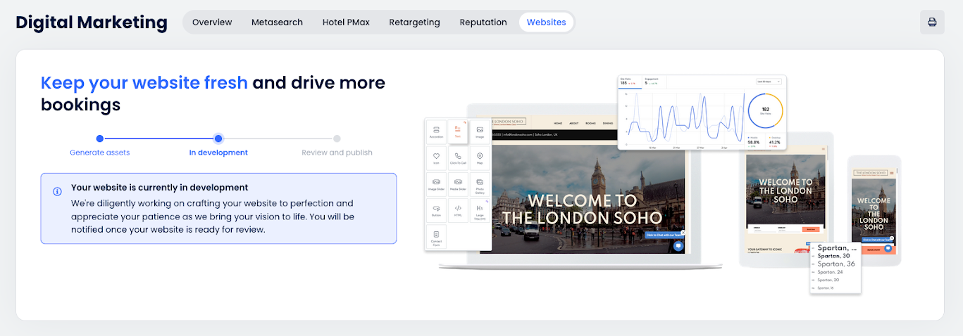 Esta funcionalidad está diseñada para propiedades que buscan una forma rápida y rentable de establecer una presencia sólida en línea e impulsar las reservas directas sin necesidad de un diseñador profesional.
