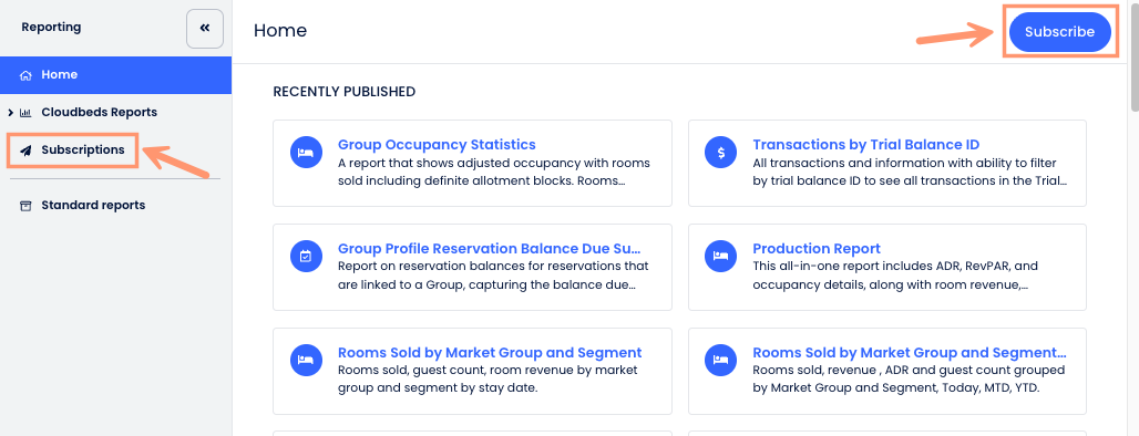 En Cloudbeds, queremos asegurarnos de que tengas los datos que necesitas exactamente cuando los necesitas. Las suscripciones te permiten recibir automáticamente en tu bandeja de entrada de correo electrónico los informes predeterminados de Insights según una programación que se adapte a ti.