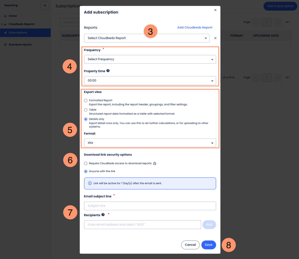 - Seguridad de descarga: Elige si el destinatario debe iniciar sesión en Cloudbeds para descargar el informe o si "Cualquier persona con el enlace" puede acceder a él.