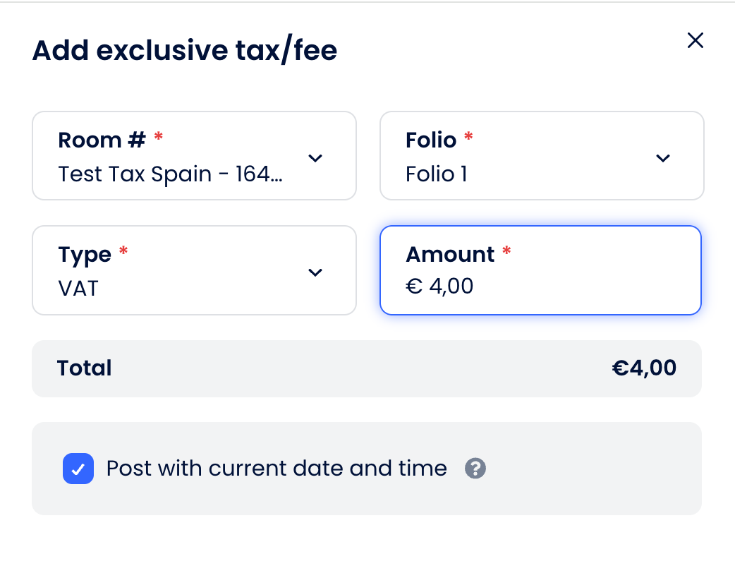 - Asegúrate de seleccionar el impuesto correcto que se aplicará al ingreso por habitación; el impuesto se calculará automáticamente y se añadirá al folio.