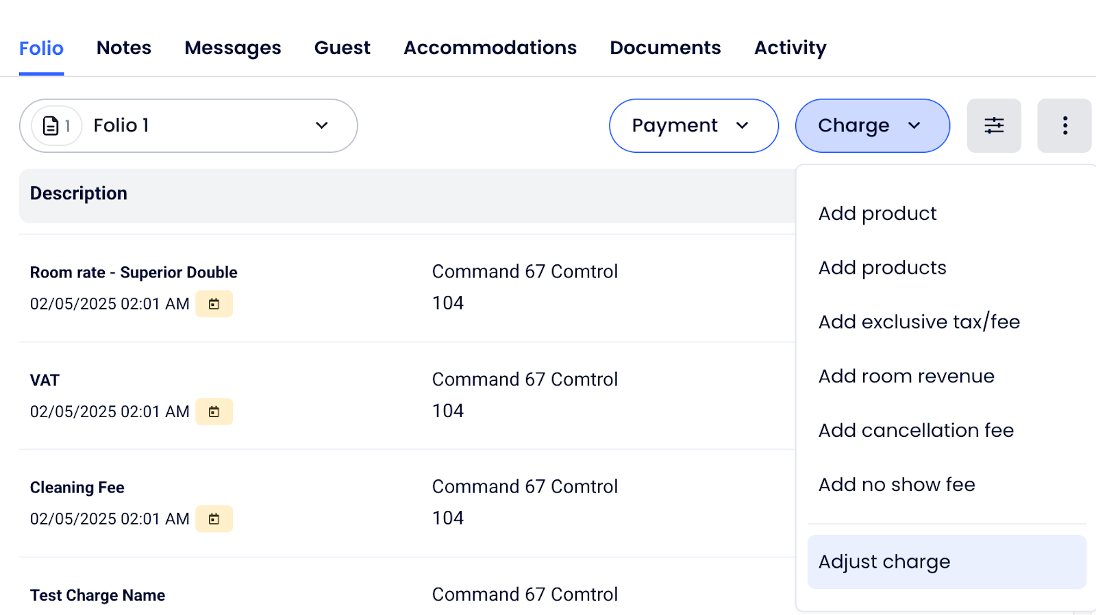 - Selecciona Cargo->Añadir ingreso por habitación para la base del ingreso por habitación, con Tipo de cargo: Tarifa de habitación.
