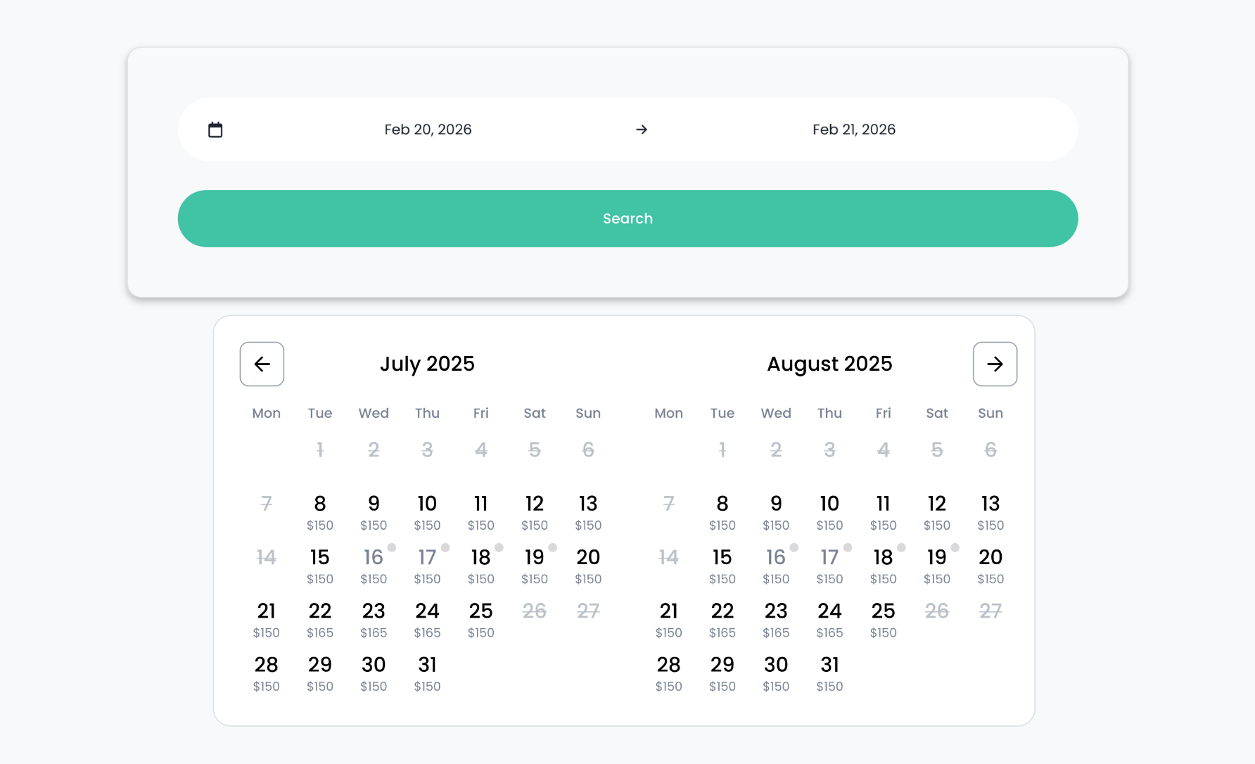 Selector de fechas de reserva fácil de usar que muestra la disponibilidad y el precio de un vistazo.
