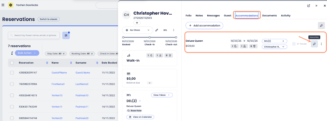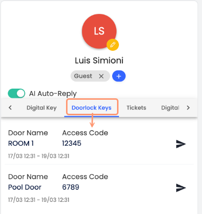 - Panel de Cloudbeds Guest Experience: En la pestaña Doorlock Keys de la barra lateral de la conversación.