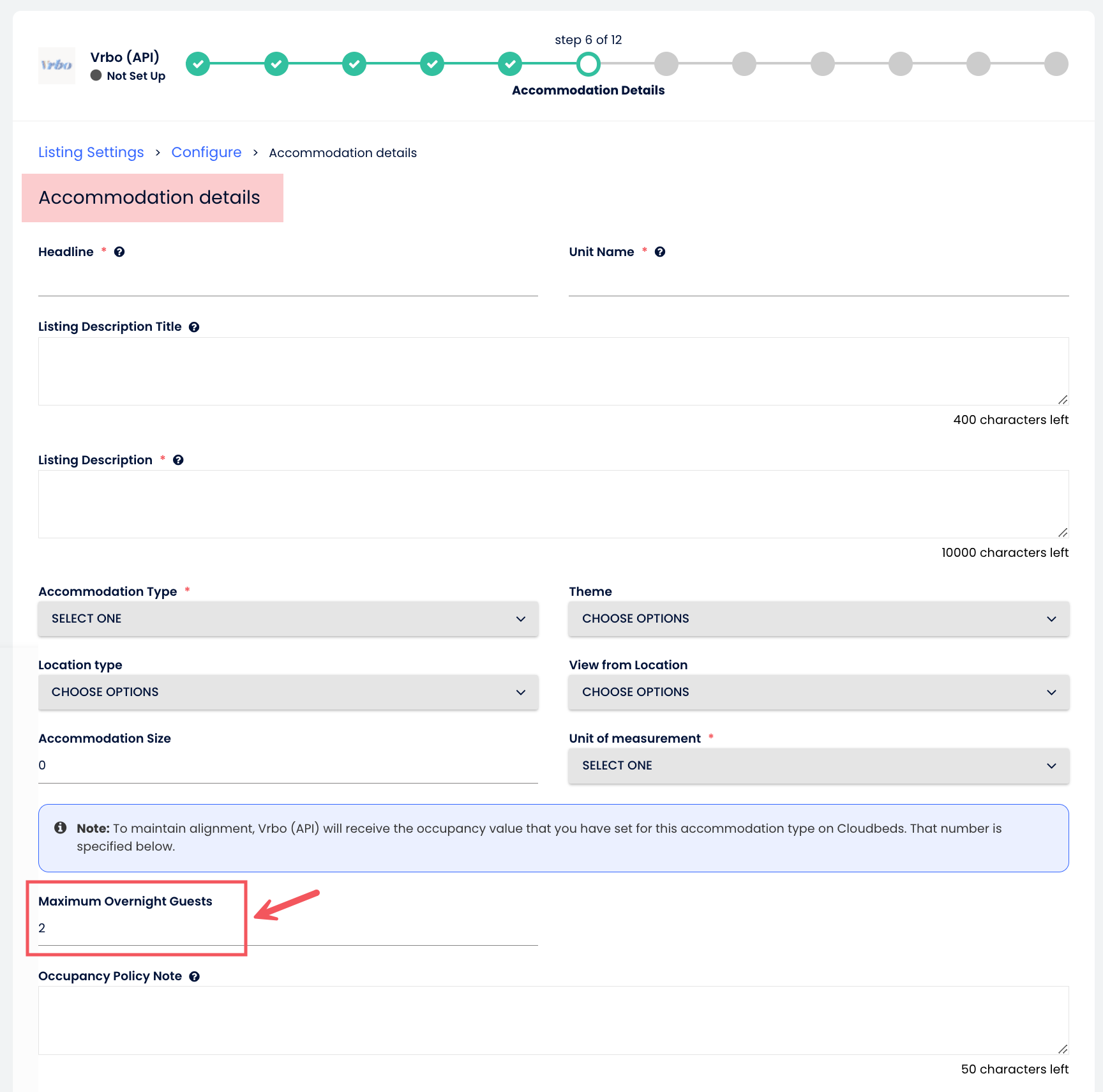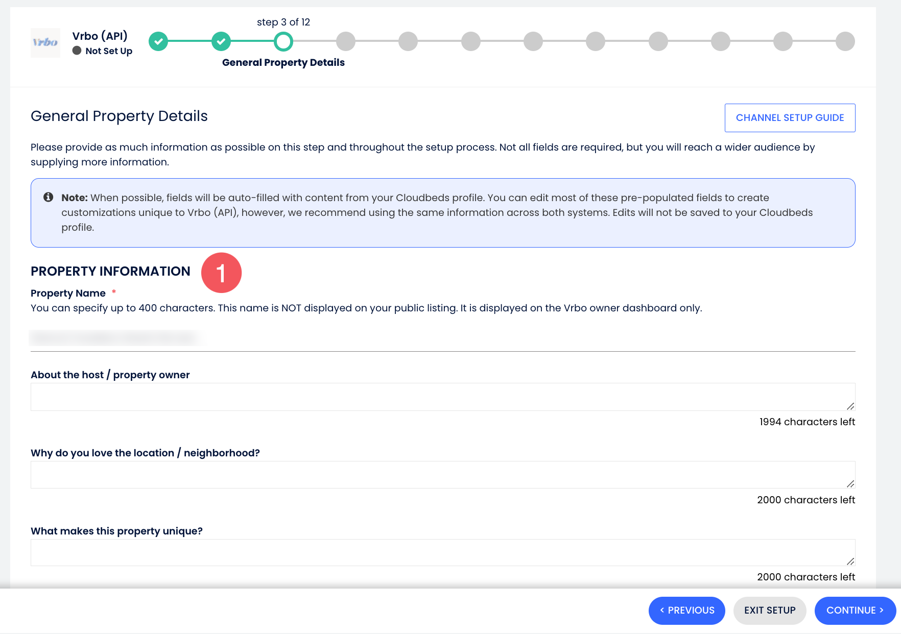 Puedes editar la mayoría de los campos completados previamente para crear personalizaciones de Vrbo (API). Recomendamos usar la misma información en ambos sistemas, ya que los cambios no se guardarán en tu perfil de Cloudbeds.