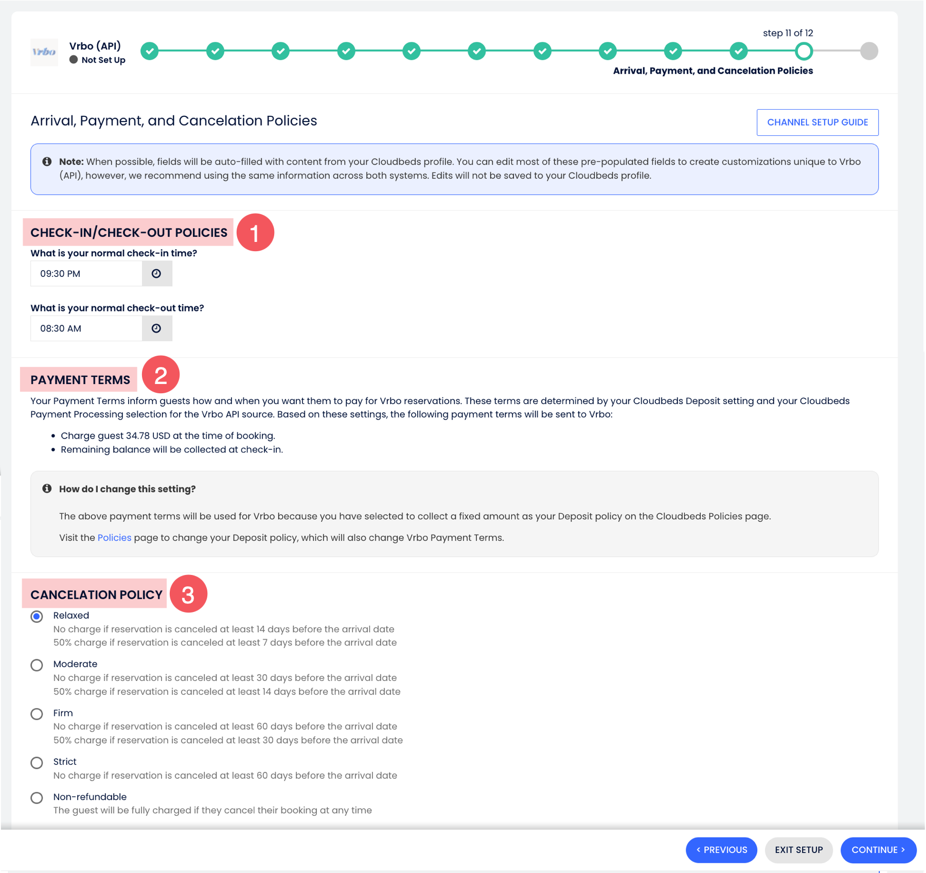 - Condiciones de pago: Se determinan según tu configuración de depósitos en Cloudbeds y tu selección de procesamiento de pagos en Cloudbeds para la fuente de la API de Vrbo.