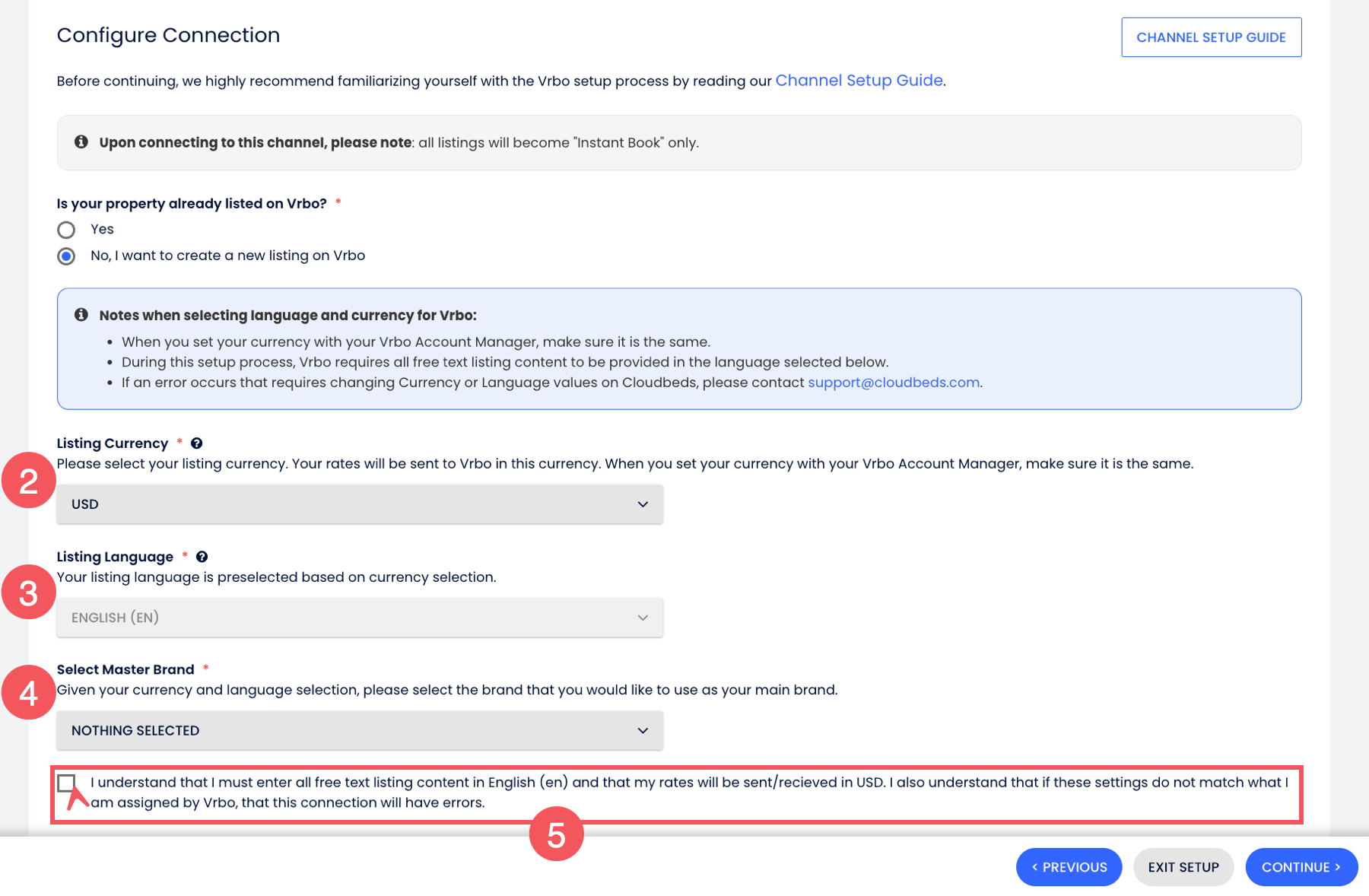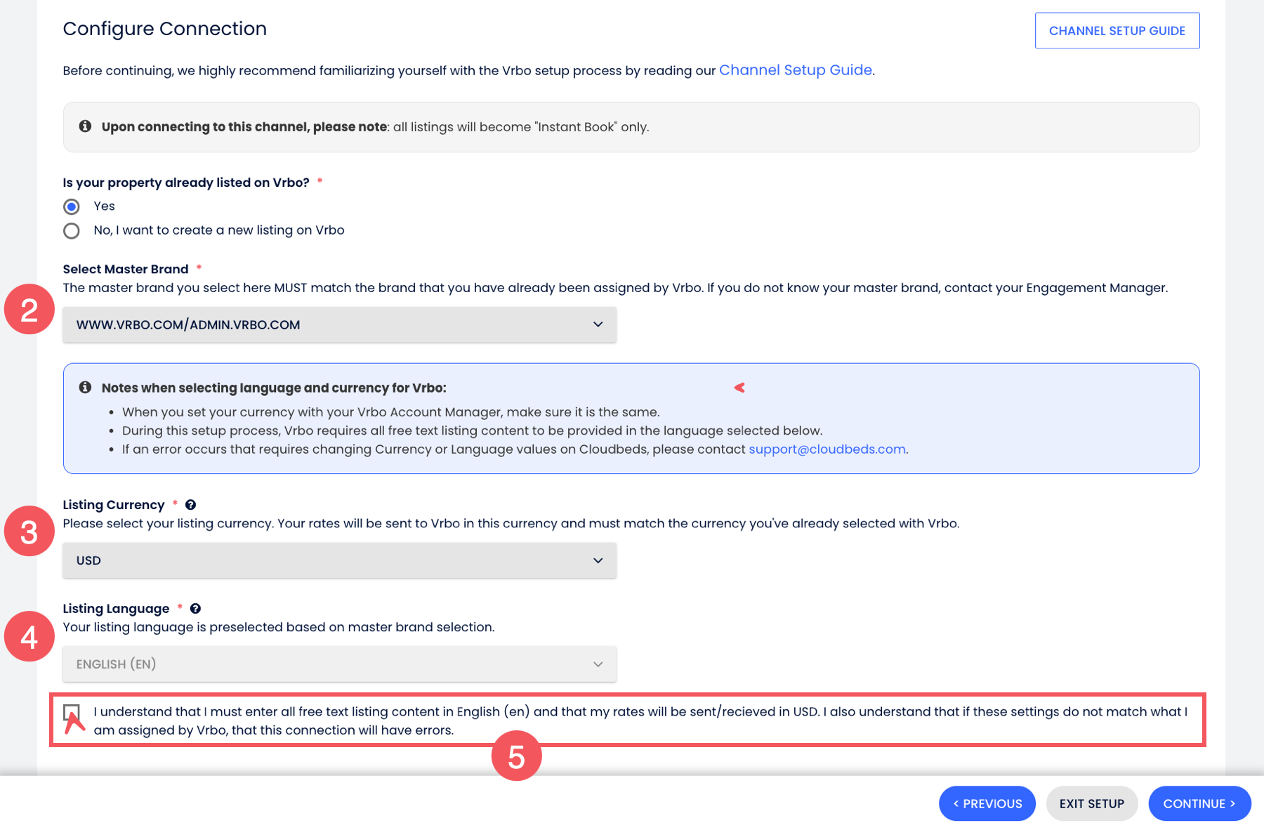 - Marca la casilla para aceptar que, durante este proceso de configuración, Vrbo requiere que todo el contenido de texto libre del listado se proporcione en el idioma seleccionado arriba y luego haz clic en Continuar.