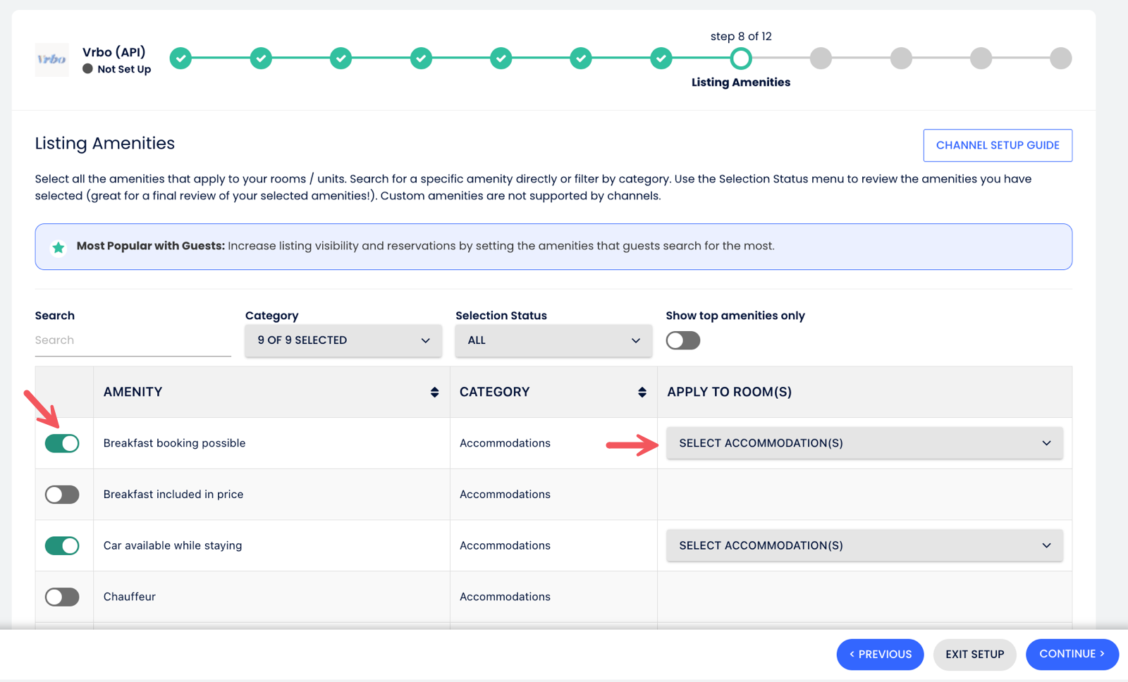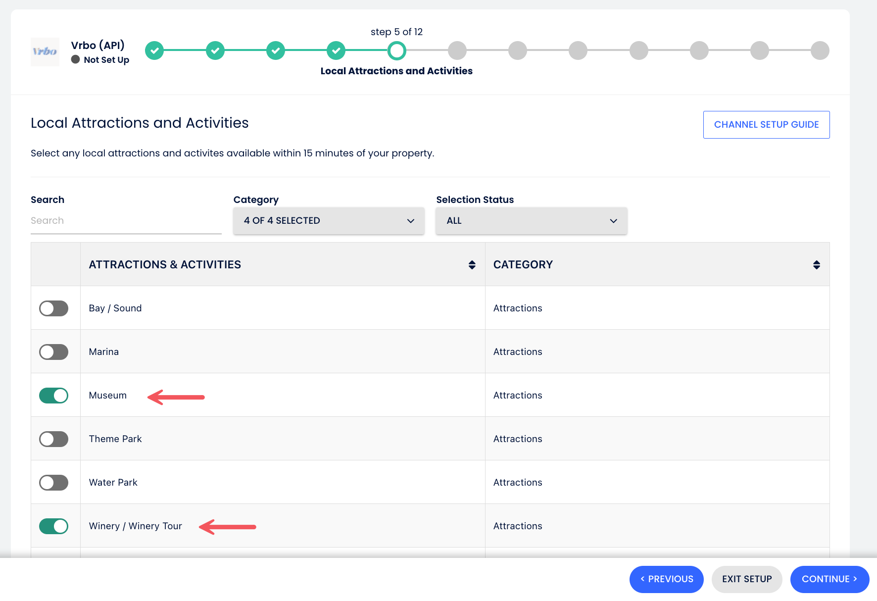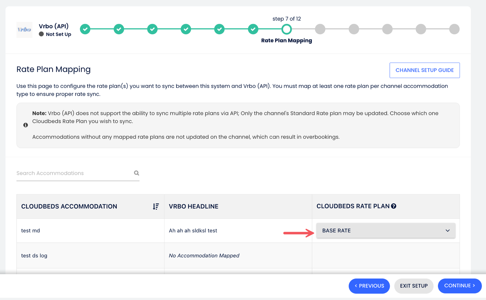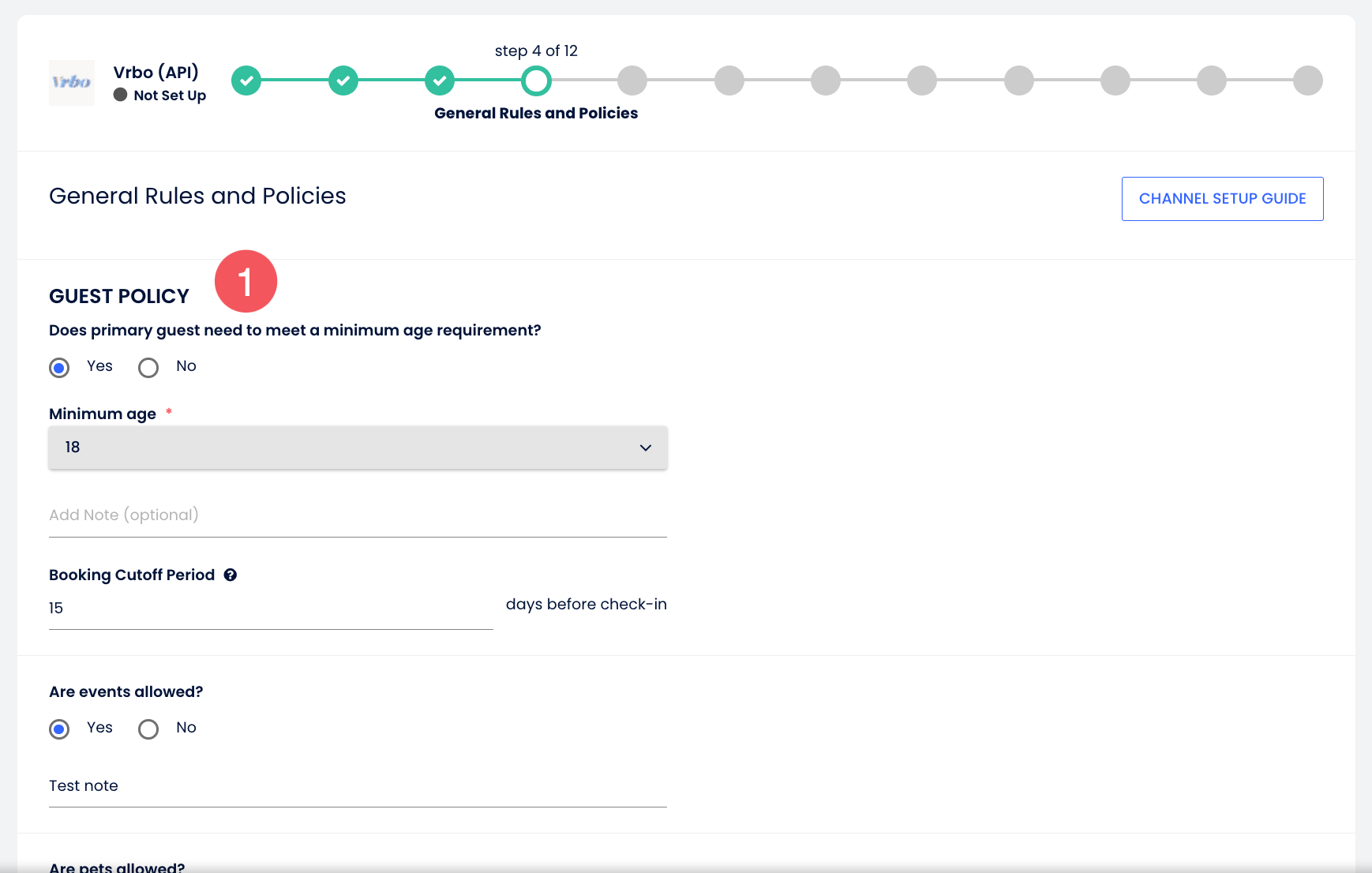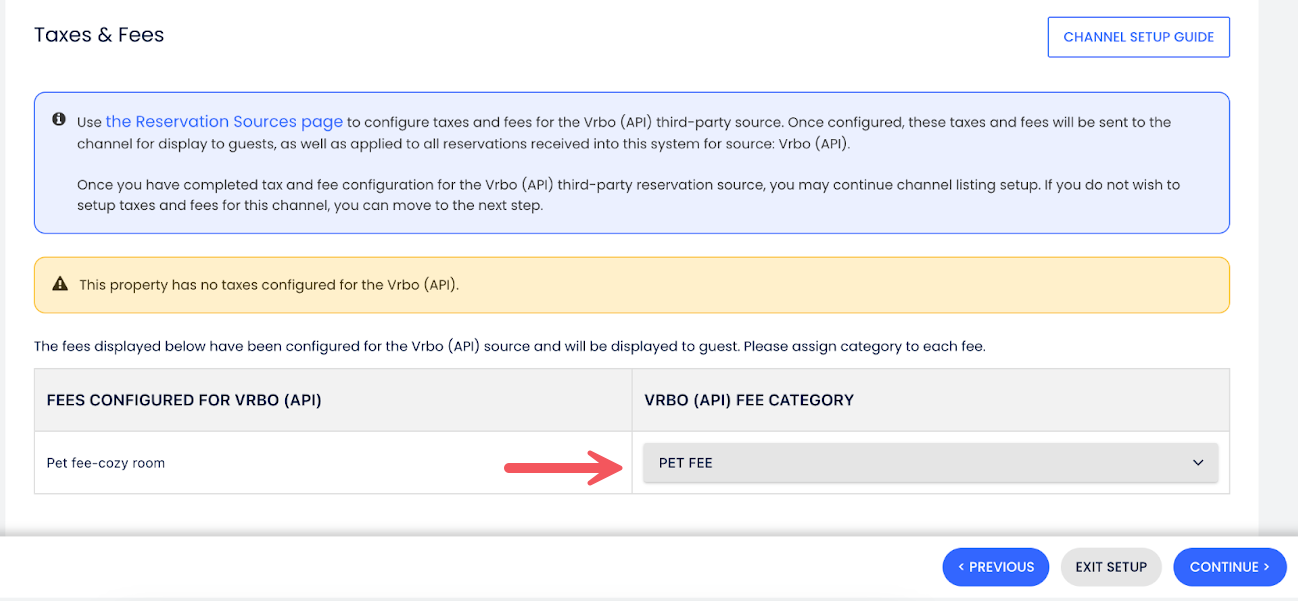 - Una vez que hayas completado la configuración de impuestos y cargos para la fuente externa de reservas de Vrbo (API), podrás continuar con la configuración del listado del canal y asignar tus impuestos y cargos.