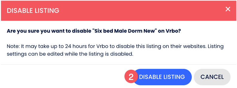 Puedes desactivar y reactivar listados en cualquier momento. Puede tardar hasta 24 horas desactivar o reactivar un listado en los sitios de Vrbo.