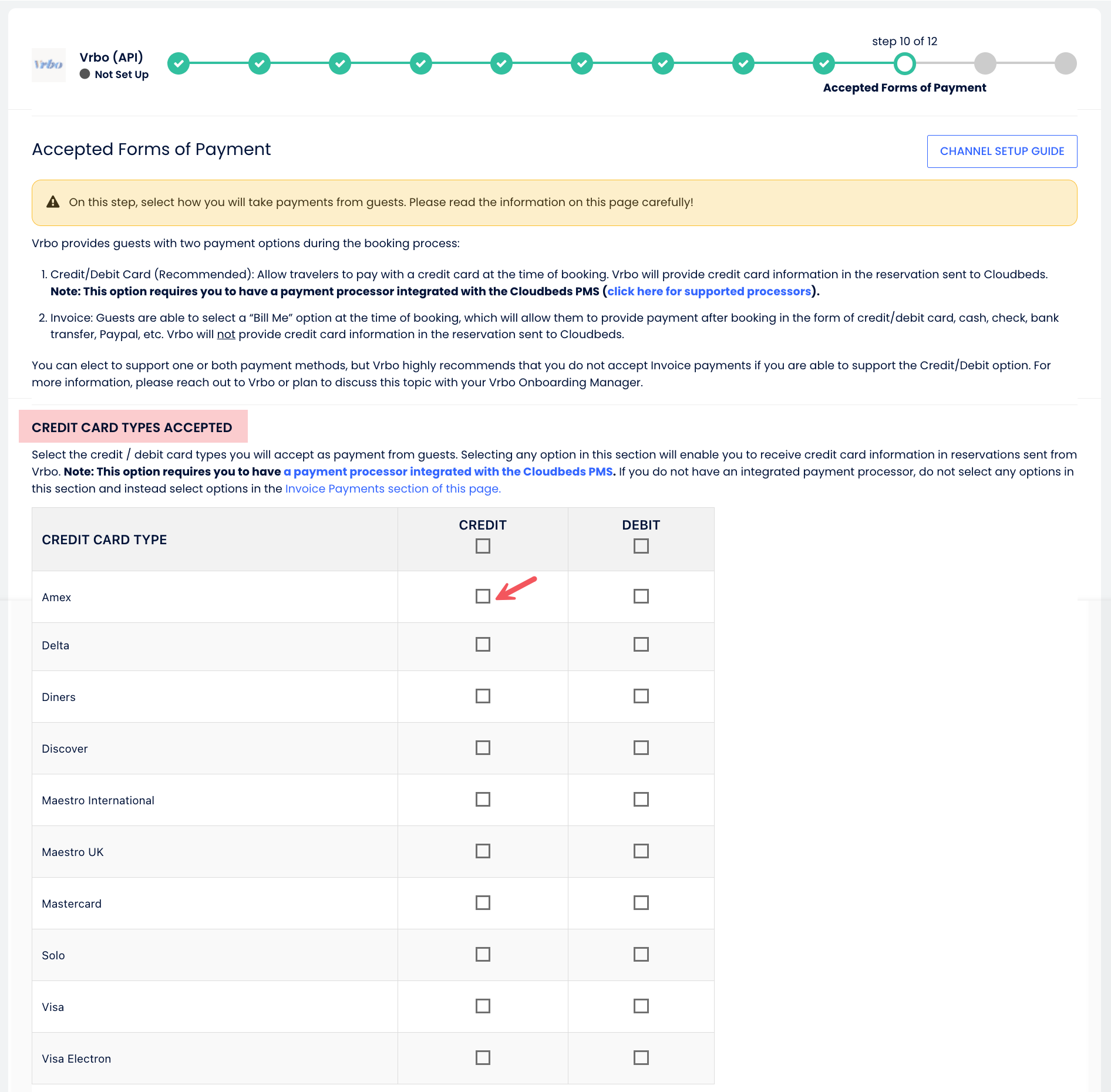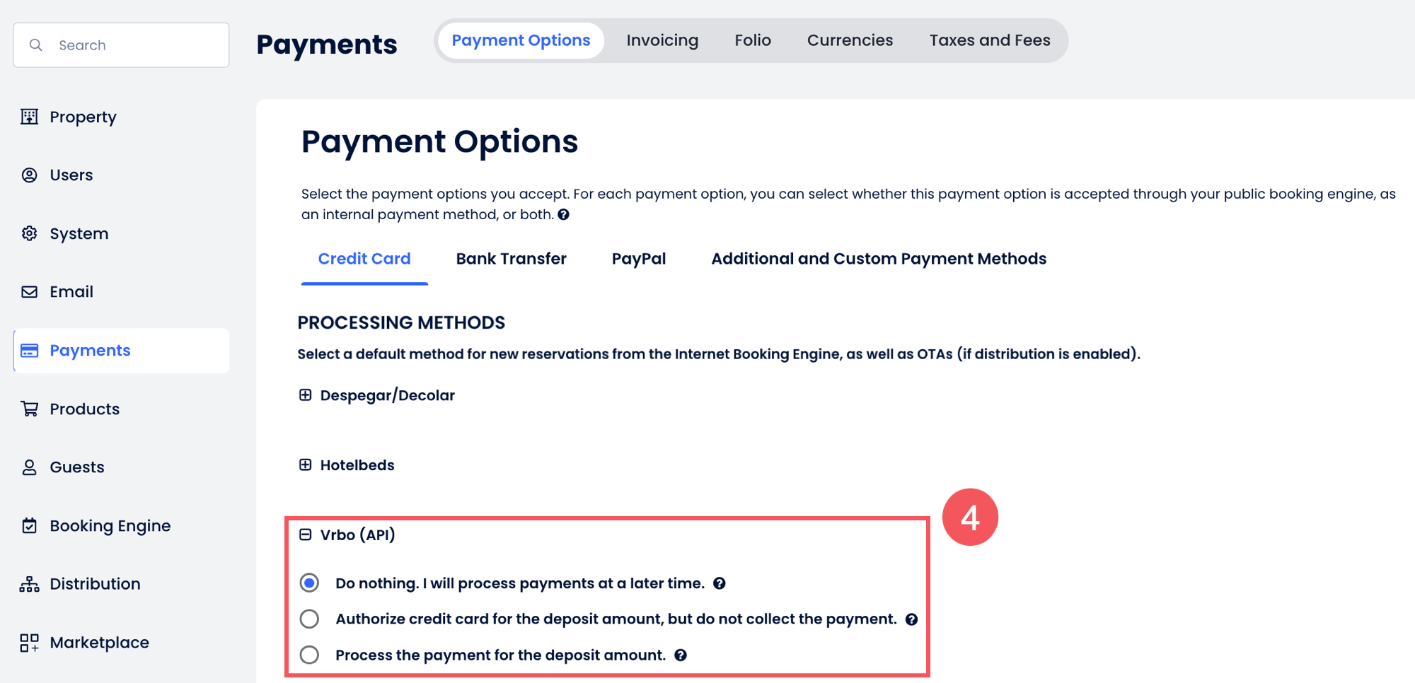 - Tarjeta de crédito/débito (recomendado): Permite que los viajeros paguen con tarjeta de crédito al momento de reservar. Vrbo proporcionará la información de la tarjeta en la reserva enviada a Cloudbeds. Nota: Esta opción requiere que tengas un procesador de pagos integrado con Cloudbeds PMS (procesadores compatibles).